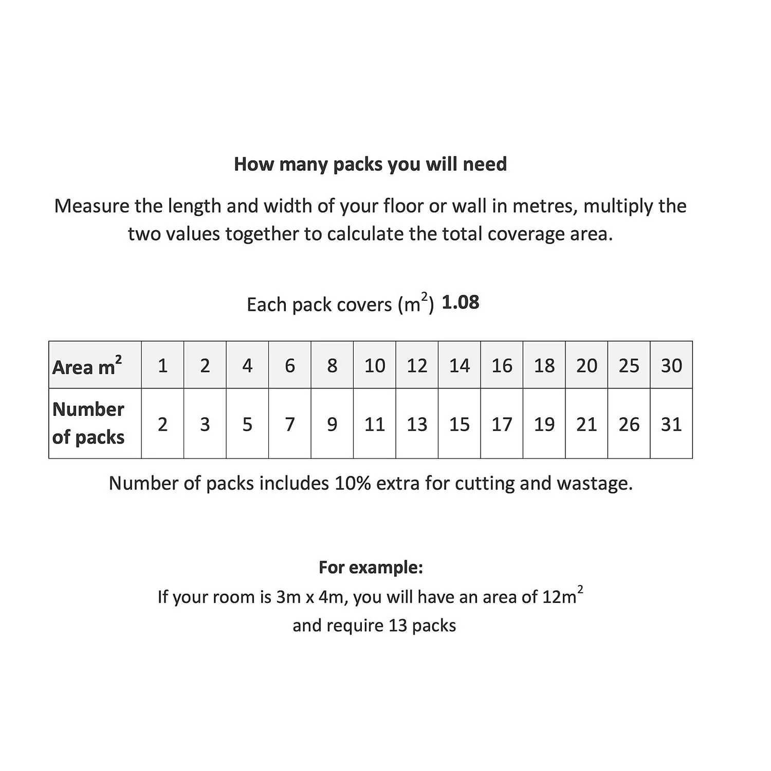 | Coverage Per Pack | 1.08 m2 |